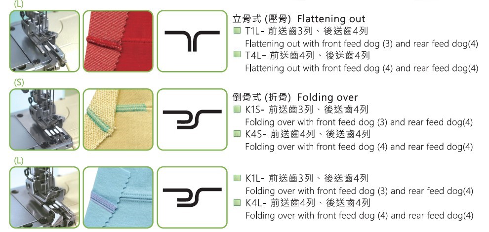 - For stitch covering use (folding over or flattening out). Suitable for knit underwear, T-shirt, sportswear etc. light to medium material.